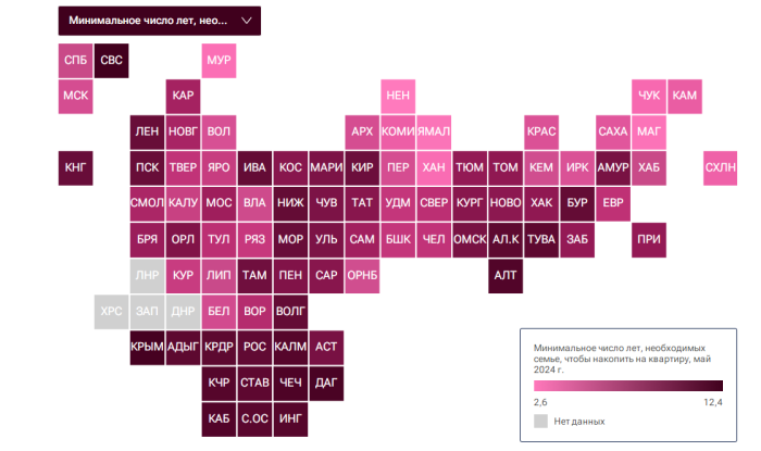 В качестве индикатора выступает оценочное минимальное количество лет, за которые семья с одним ребенком со среднестатистической зарплатой в своем регионе сможет без привлечения заемных средств накопить на квартиру площадью 60 квадратных метров в ценах на май 2024 года, ежемесячно откладывая для этой цели потенциально возможный свободный остаток денежных средств после осуществления минимально необходимых трат для поддержания текущей жизнедеятельности (прожиточный минимум в регионе для взрослых и детей) при средней зарплате за 12 месяцев (с 1 апреля 2023 по 1 марта 2024 года), и используя накопленные депозиты на 1 мая 2024 года.