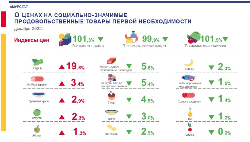 Цены на продовольственные товары в декабре 2022 года составил 99,9 %. В аналогичный период 2021 года – 101,7 %.