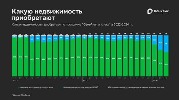 Продуктовая структура выдачиРаспределение количества выдач по программе «Семейная ипотека» по приобретенным типам недвижимости (данные Сбера). Доля сделок в общем количестве выдач по приобретению квартиры в строящемся/готовом доме обозначена как «Квартира в строящемся/готовом доме». Сюда же входят сделки по покупке недвижимости на вторичном рынке у физлица (в Ненецком и Чукотском автономных округах), инвестора или ИП, а также в сельских населенных пунктах Дальневосточного федерального округа. Приведены данные по индивидуальному жилищному строительству (ИЖС). «Остальное» включает в себя нецелевые кредиты под залог недвижимости, рефинансирование, военную ипотеку.
