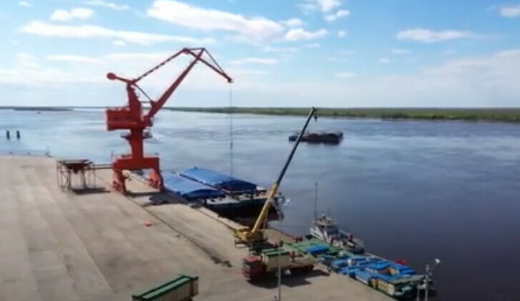 Фото: скриншот видео В речном порту Сюнькэ дополнительно задействуют плавучий подъёмный кран, чтобы ускорить погрузку и разгрузку грузов из соседнего Поярково в сезон навигации 2023 года на Амуре, сообщает телевидение Хэйхэ.