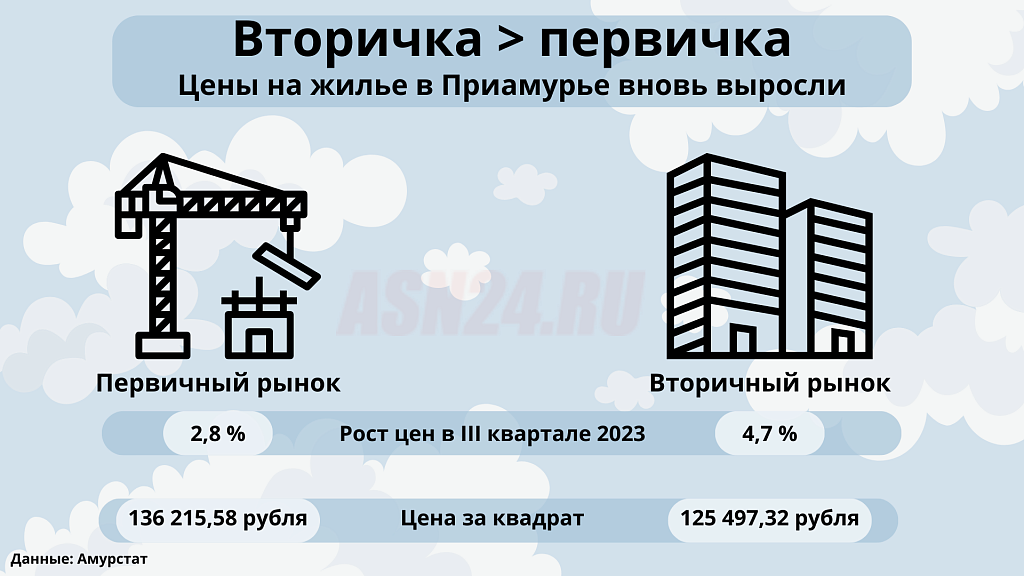 Цены на жилье на первичном рынке в третьем квартале 2023 года выросли на 2,8 %, а на вторичном — на 4,7%. Такими цифрами роста стоимости жилья в Амурской области по сравнению с предыдущим кварталом этого года вчера, 31 октября, поделились в Амурстате.