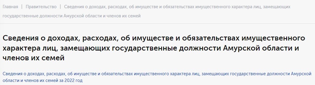 В предыдущие годы там размещалась информация о размере доходов и имуществе губернатора Амурской области, всех зампредов и министров амурского правительства за предыдущий год.