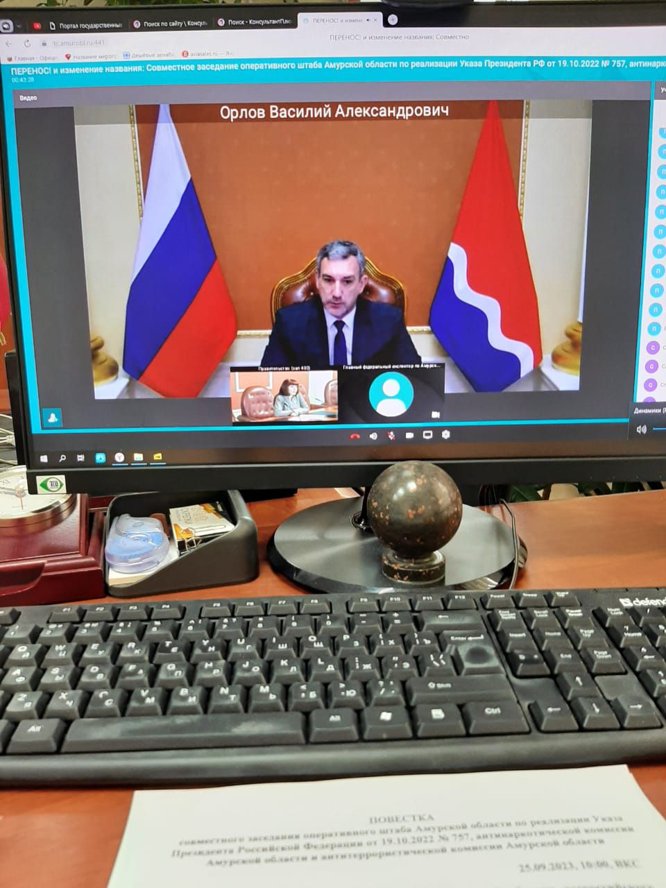 25 сентября 2023г. начальником Управления Минюста России по Амурской области Т.Б. Лазаренко принято участие в совместном заседании оперативного штаба Амурской области по реализации Указа Президента РФ от 19.10.2022 № 757, антинаркотической комиссии Амурской области и антитеррористической комиссии Амурской области, проведенном в режиме видеоконференции под председательством губернатора Амурской области В.А. Орлова.