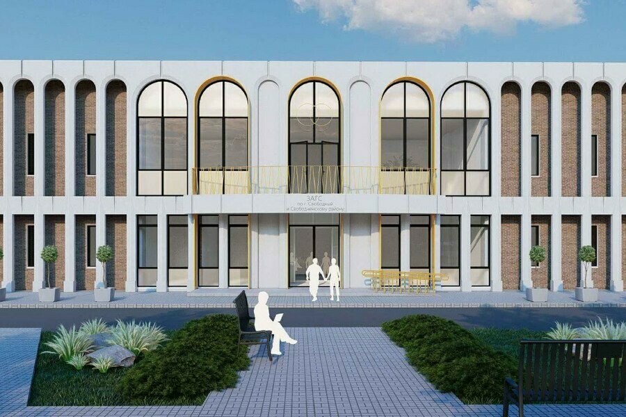 Площадь нового ЗАГСа составит порядка 2000 квадратных метров. Главный вход двухэтажного здания выделят дополнительными арками. Фасад гармонично впишется в окружающую застройку за счет того, что архитектурные элементы повторят фасад стоящего рядом храмового комплекса православной церкви.