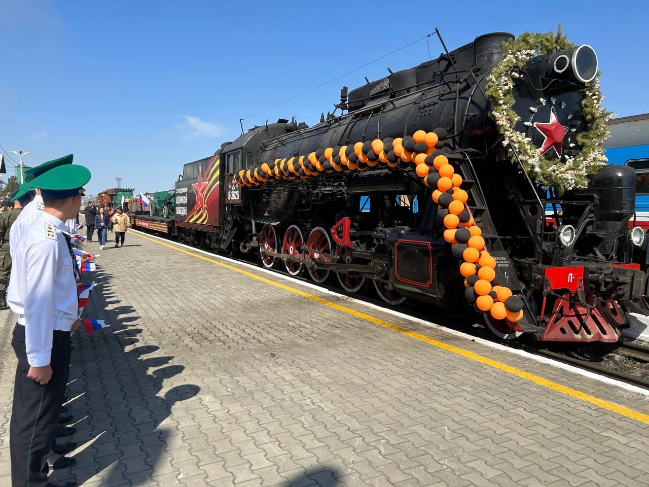 На вокзале поезд пробыл с 10:00 до 11:30. В его составе две платформы с образцами военной техники, платформа-сцена, вагон-теплушка и три пассажирских вагона. Также можно увидеть образцы военной техники: гаубичное орудие Д-1, боевую машину реактивной артиллерии БМ-13 «Катюша», 37-мм зенитную пушку АЗП-39.