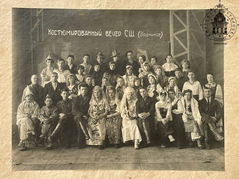 Фото невероятно красивое и атмосферное. Школьники потрудились над костюмами и своими образами. Вероятно, вечер мог быть в канун Нового года, так как, помимо национальных костюмов, есть трое ребят в костюмах клоунов, - пишут коллекционеры. Также на фото присутствуют шестеро взрослых мужчин в костюмах, несколько из них в военной форме. Неокраеведы предполагают, что это могут быть преподаватели, организаторы вечера или приглашённые гости.