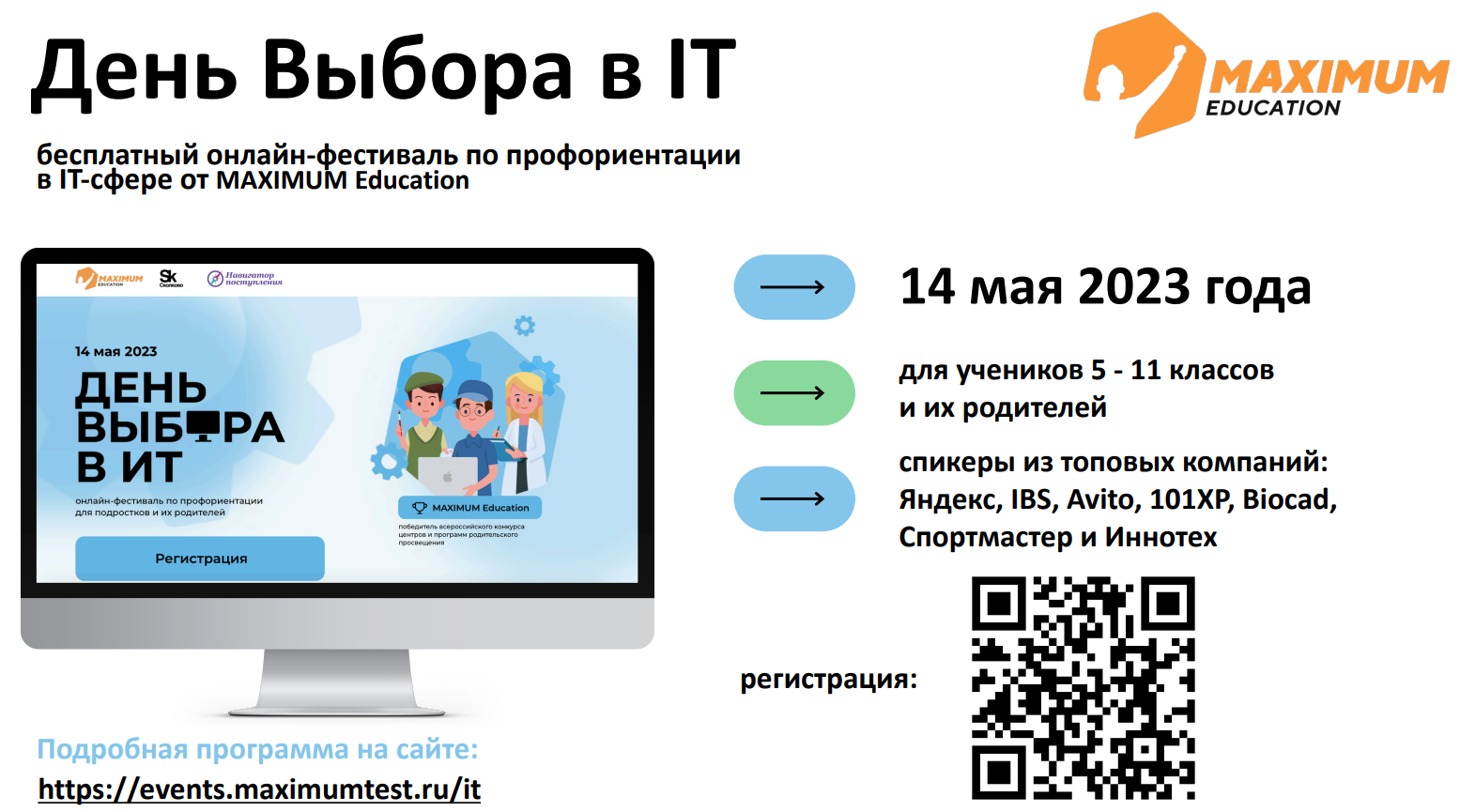 Информируем о проведении и возможности принять участие учащимся 5–11 классов и их родителям в бесплатном фестивале по профориентации «День Выбора в IT» , который пройдет в онлайн-формате 14 мая 2023 года.