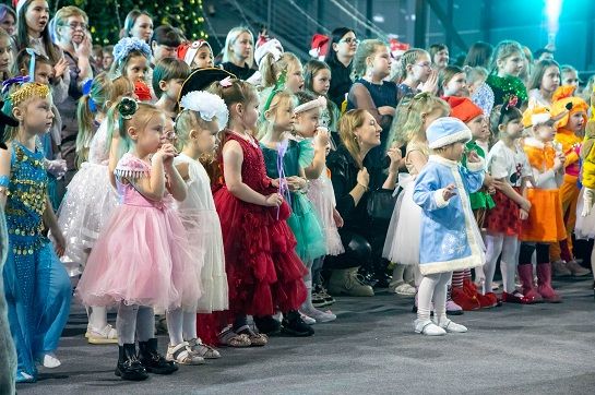 Не обошлось и без хороводов, вокруг десятиметровой елки, украшенной светящейся звездой и длинными гирляндами и сотнями шаров и игрушек. Новый универсальный залу площадью порядка полутора тысяч квадратных метров позволил водить хоровод сразу в три ряда.