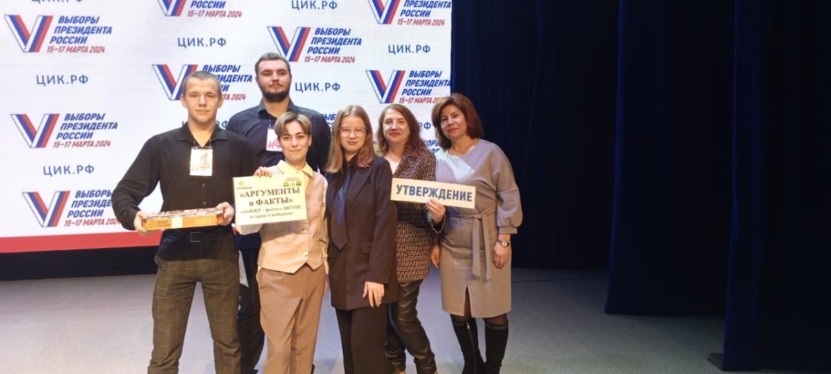 20.12.2023г. в Общественно-культурном центре г. Благовещенск состоялись молодежные дебаты «Голос молодого избирателя особо ценен». Команду студентов Амурского института железнодорожного транспорта подготовила председатель УИК 1517, преподаватель СПО СТЖТ Зырянова Елена Леонидовна. Команда «Аргументы и факты» в составе трёх студентов: Негода Вячеслава, Реховской Анны и Воронцова Алексея защищали свою позицию по теме «Трёхдневное голосование на выборах президента РФ». Ребята аргументированно отстояли свою «позицию-утверждение». Мероприятия, которые проводит Амуризбирком, всегда проходят интересно. Наградой ребятам был сертификат участника и ароматная пицца.