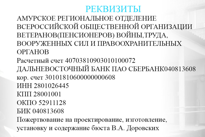 Сбор средств проводит региональное отделение общественной организации ветеранов войны, труда, вооруженных сил и правоохранительных органов. Инициативная группа благодарит руководителя отделения организации Валентину Швец за помощь в реализации проекта.
