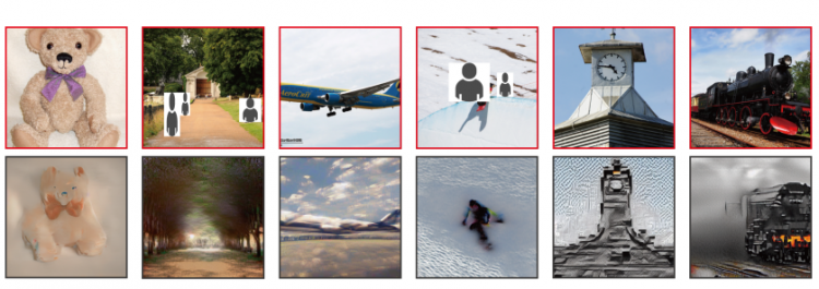Авторы работы смогли воссоздать изображения "из мыслей" людей на основе данных, полученных во время процедуры и пропущенных через нейросеть. Сначала научились предсказывать скрытое представление по сигналам фМРТ, а потом в модель добавили данные фМРТ и шум. В результате исследователи получили окончательные изображения (сверху - реальные картинки, снизу - картинки, полученные нейросетью).
