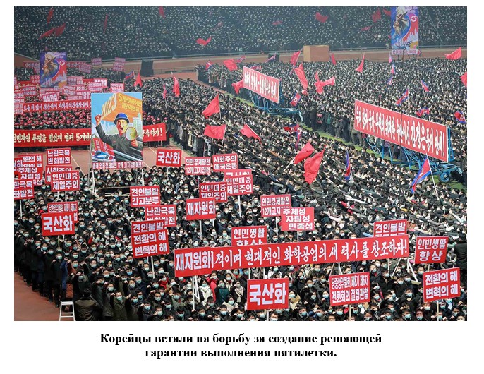 Сегодня все корейцы, как один, поднялись на борьбу за создание решающей гарантии выполнения пятилетнего плана, намеченного VIII съездом Трудовой партии Кореи.