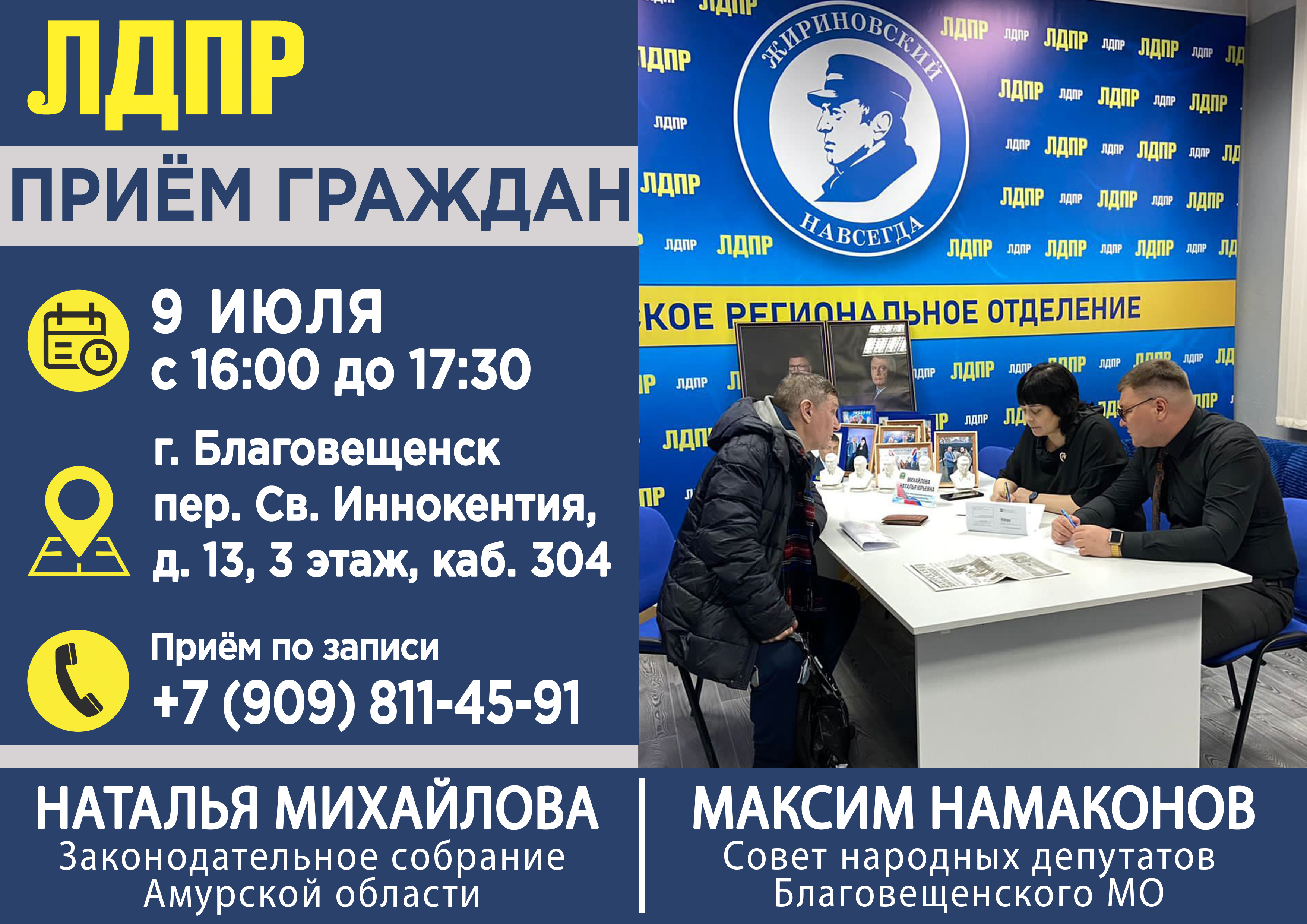 9 июля с 16:00 до 17:30 руководитель фракции ЛДПР в областном Заксобрании Наталья Михайлова и депутат Совета Благовещенского МО Максим Намаконов проведут приём граждан по адресу: г. Благовещенск, пер. Святителя Иннокентия, д. 13, 3 этаж, каб. 304