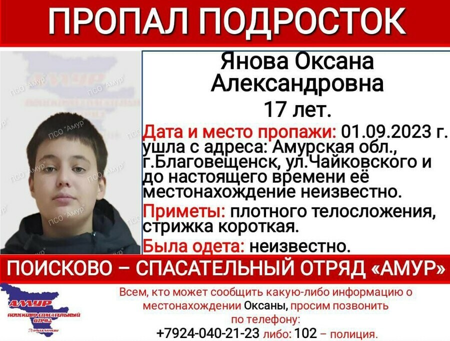 Всех, кто может сообщить какую-либо информацию о местонахождении подростка, ПСО «Амур» просит позвонить по телефонам: +7924-040-21-23, 102 – полиция.