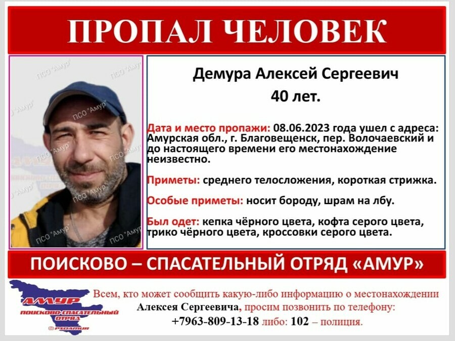 В Благовещенске несколько дней ищут Алексея Демура. Мужчина пропал 8 июня, и до настоящего времени его местонахождение неизвестно.