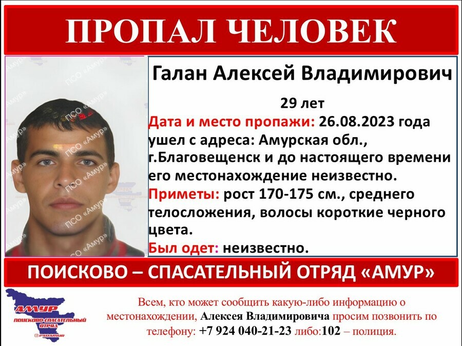 Фото: ПСО «Амур» 29-летний Алексей Владимирович Галан пропал 26 августа. О его местоположении с тех пор ничего неизвестно, сообщает ПСО «Амур».