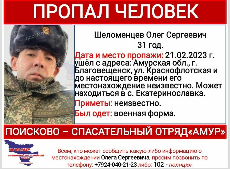 В Благовещенске 21 февраля февраля пропал Шеломенцев Олег Сергеевич. В момент пропажи он был одет в военную форму.