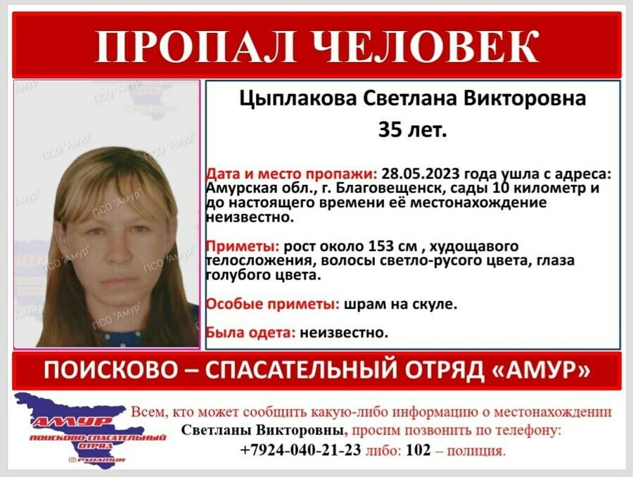Поисковики ПСО «Амур» ищут Светлану Викторовну Цыплакову. 28 мая 35-летняя женщина ушла с садового участка (Благовещенск, 10-й километр), и до настоящего времени ее местонахождение неизвестно.