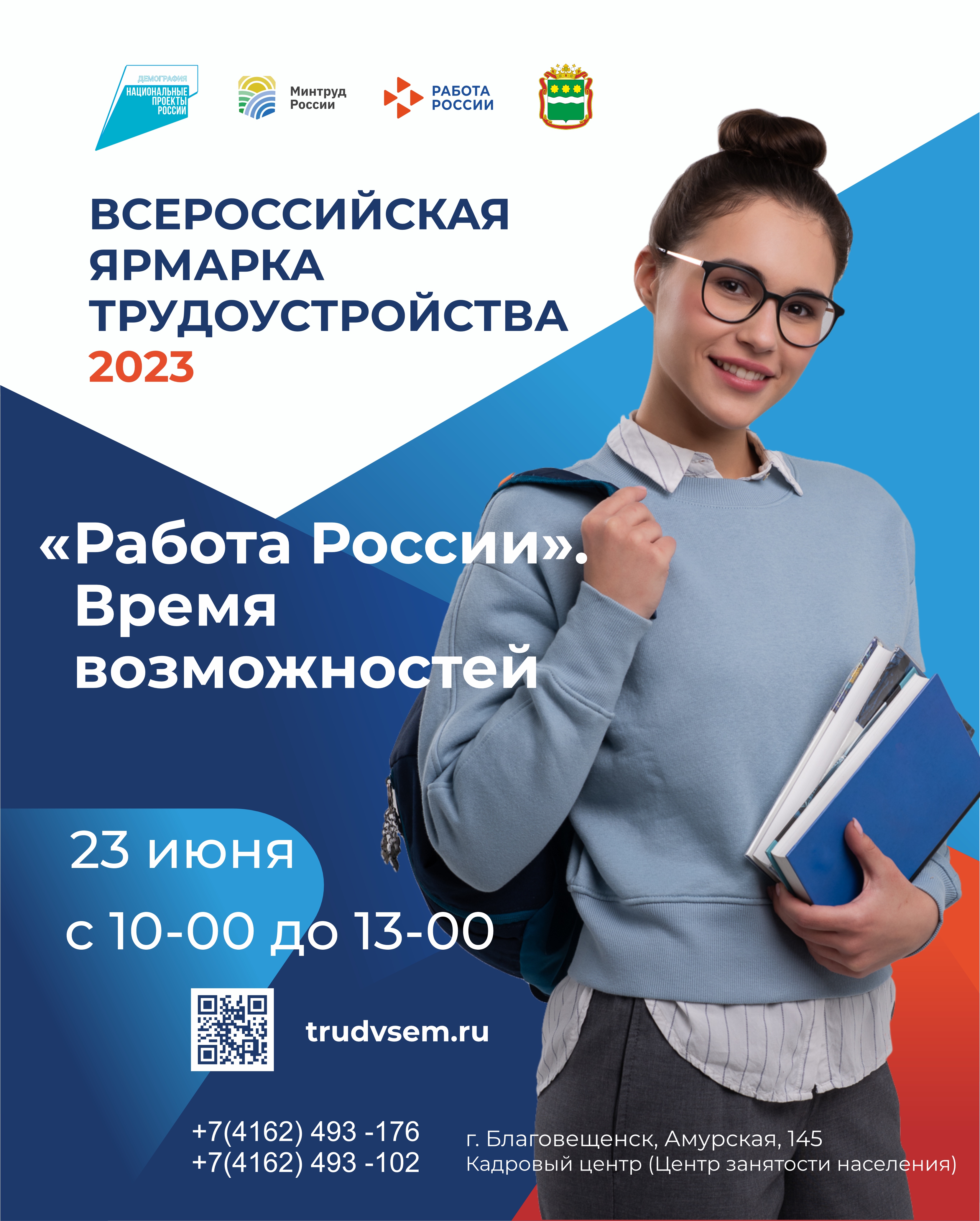 23 июня на территории области проводится Всероссийская ярмарка трудоустройства «Работа России. Время возможностей». Основной площадкой проведения мероприятия станет кадровый центр «Работа России» Центр занятости населения в г. Благовещенск, ул.Амурская, 145 В этот же день её проведут во всех районных отделах Центра занятости населения области.
