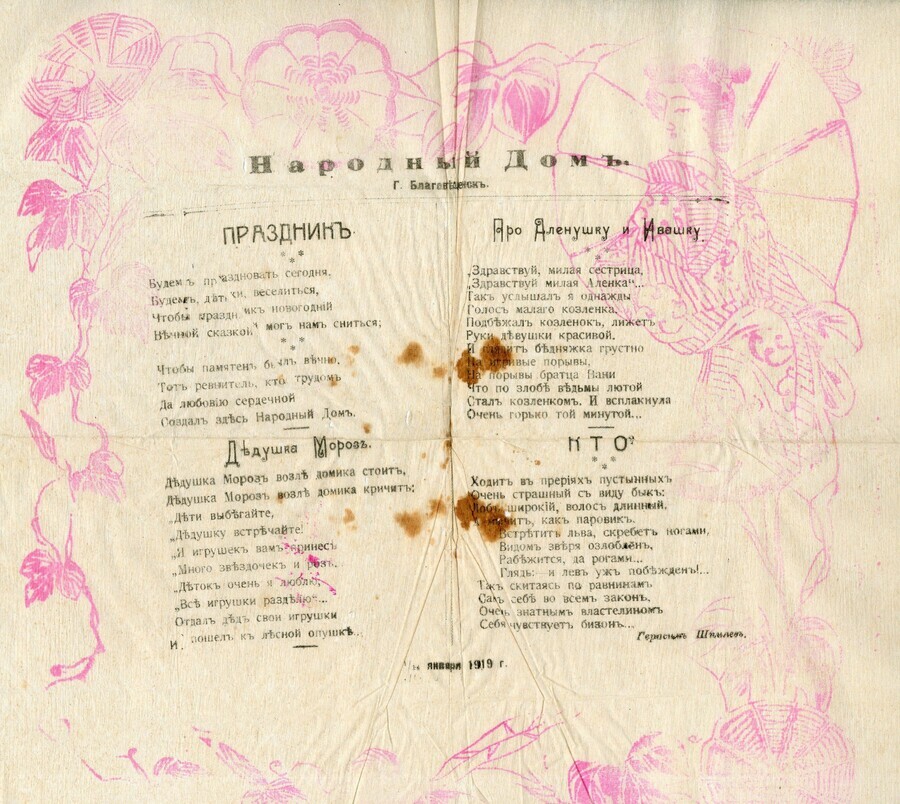 Такие «открытки» «с напечатанными стихами Герасима Шпилева» сотрудники Народного дома «вкладывали в пакет с подарками для детей на рождественской ёлке 1/14 января 1919 года». И ёлка, и подарки предназначались «для детей беднейшего населения» Благовещенска. Напомнил автор и о «ревнителе», «кто трудом да любовию сердечной создал здесь Народный Дом», кто брал на себя «украшение ёлки, приготовление подарков, угощение детей», рассказали в архиве.