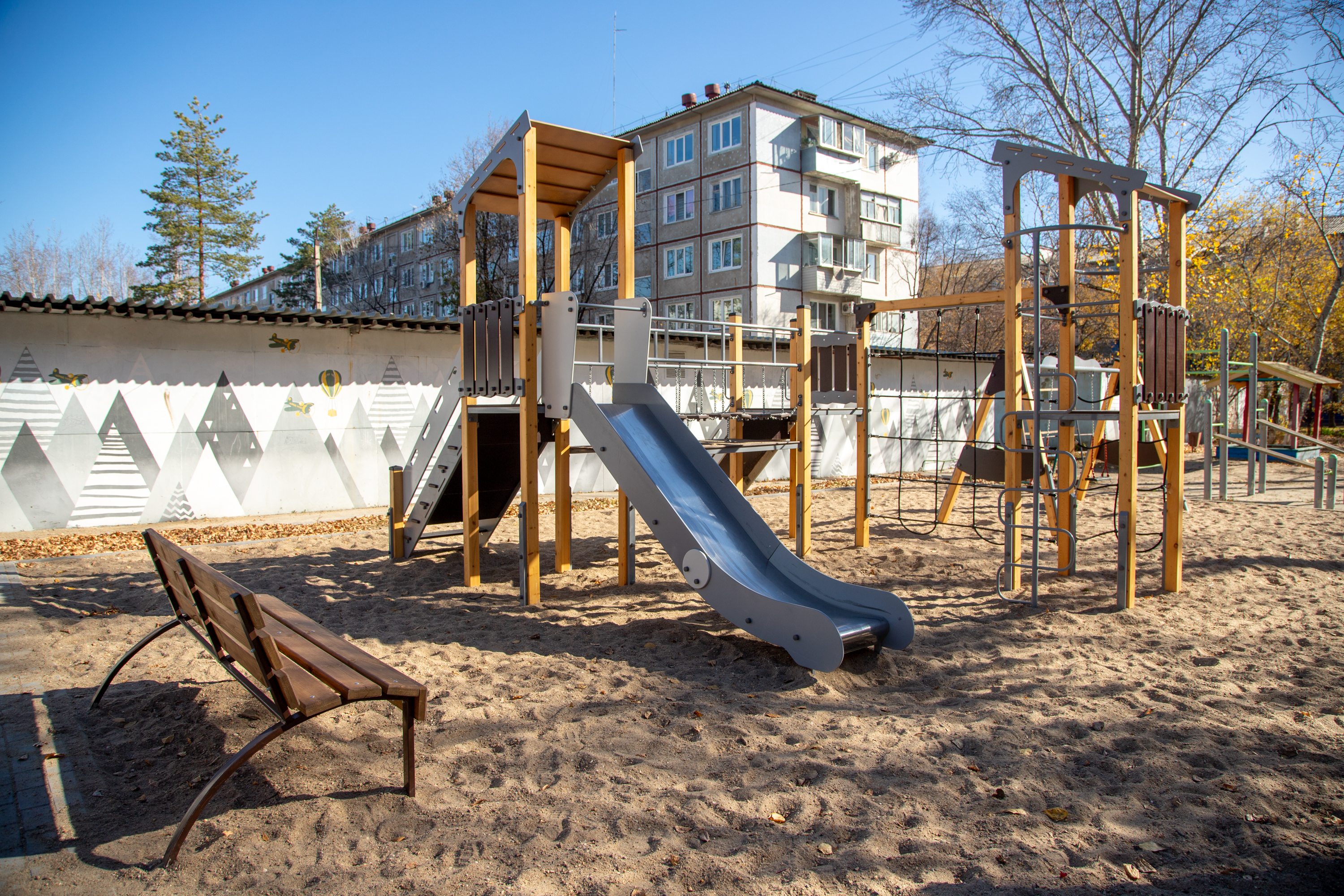 Красок своему двору добавили жители дома на Кантемирова, 8. На неприглядном гаражном массиве изобразили горы, самолеты и воздушные шары. Картина смотрит на детскую площадку, которую в этом году еще и благоустроили по нацпроекту «1000 дворов».