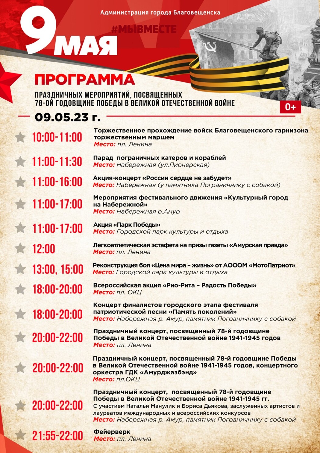 С 20:00 до 22:00 перед ОКЦ, на площади Ленина и на набережной у памятника пограничнику с собакой пройдут двухчасовые праздничные концерты, посвященные 78-й годовщине Победы в Великой Отечественной войне 1941-1945 годов. На набережной выступят заслуженные артисты и лауреаты международных и всероссийских конкурсов Наталья Манулик и Борис Дьяков.