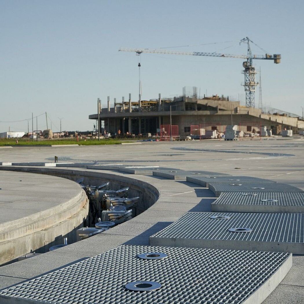 Для чаш разработали котлован глубиной 2,5 метра, а для устойчивости конструкции возвели свайный фундамент. Коммуникации и центр управления находится под землей.
