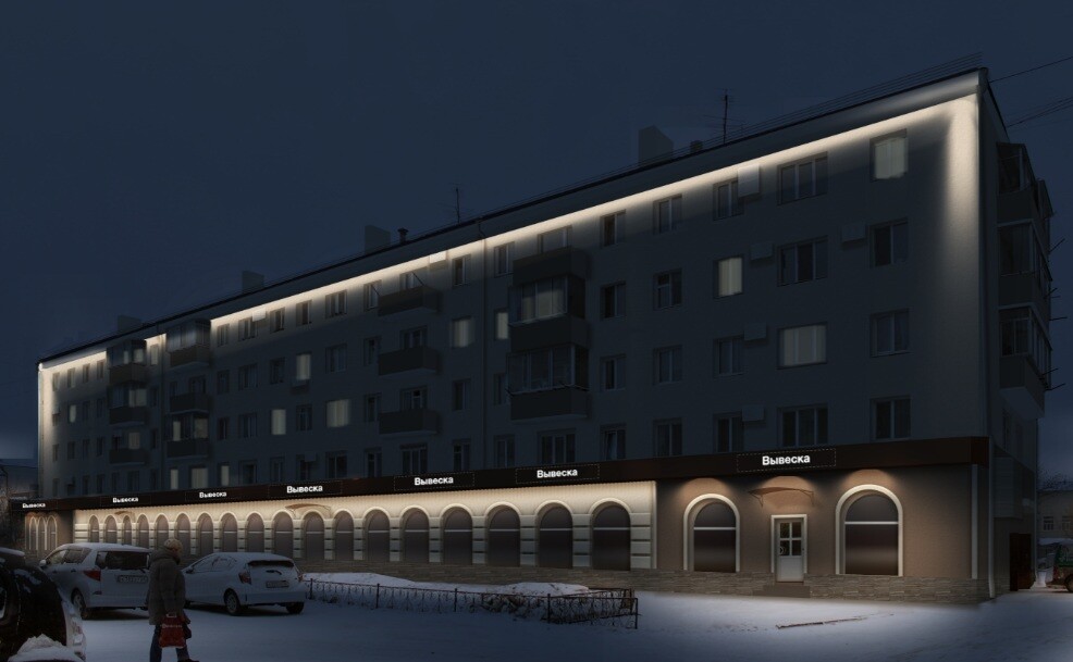 Не забыли специалисты и о внешнем виде здания в темное время суток. Осветить здание предлагают по контуру, чтобы проявить его габариты, скорректировать пропорции и сделать визуально выше.