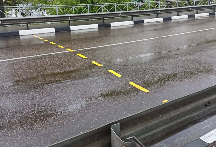 Водители должны строго соблюдать дистанцию 40 метров при следовании через путепровод. На подходах к нему нанесена желтая разметка, на бетонных опорах освещения появятся соответствующие предупреждения.