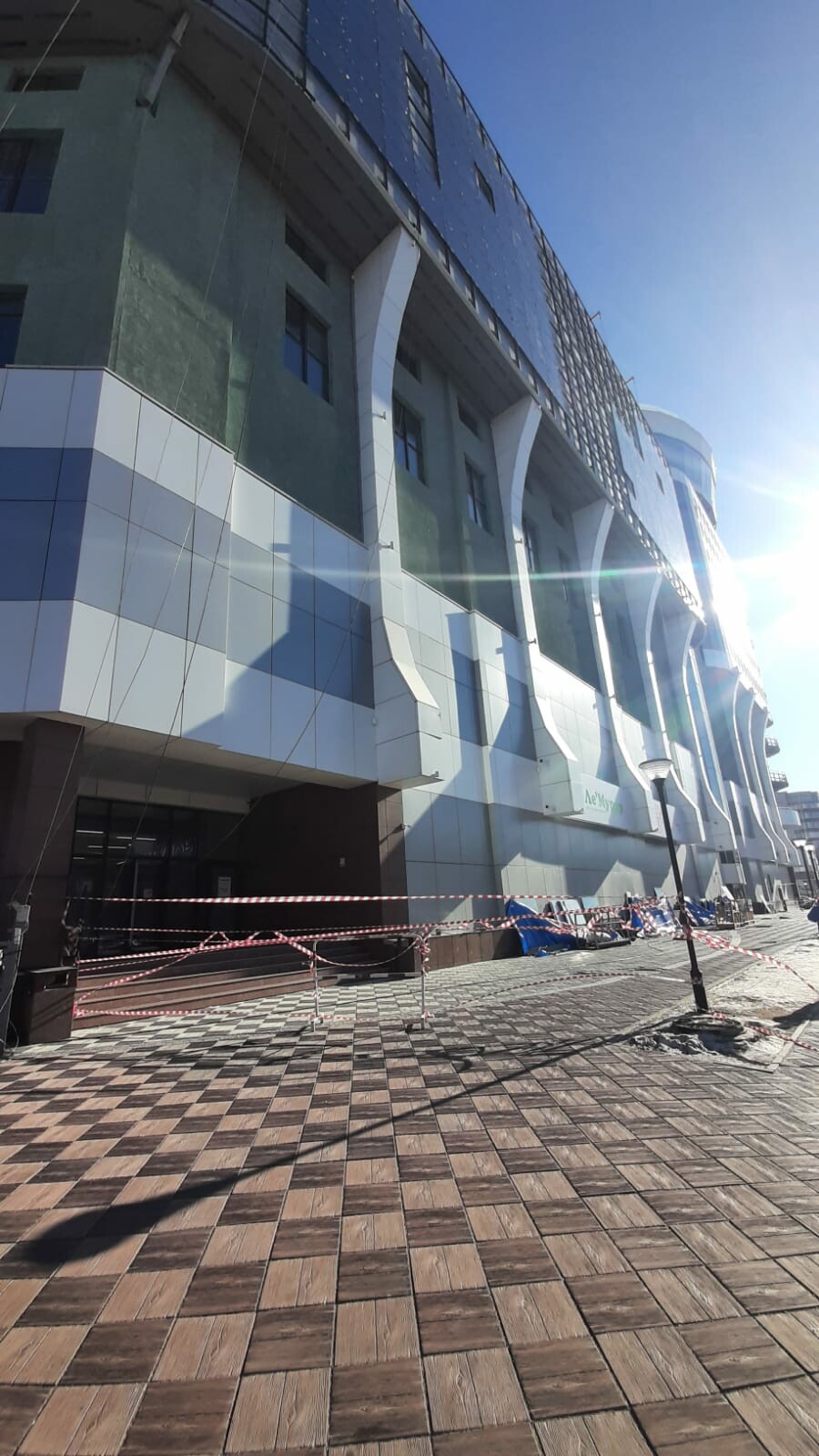 Пешеходную зону вдоль здания в настоящее время огородили сигнальной лентой. Там также установлены подвесные фасадные подъемники и подготовлено облицовочное стекло. Люди обходят это место по тропинке, расположенной рядом.