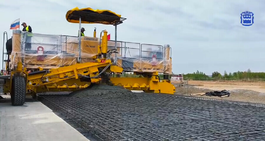 Строители практически завершили бетонирование нижнего слоя взлетно-посадочной полосы, смонтировали армокаркасы и приступили к бетонированию основного верхнего слоя покрытия будущей полосы.