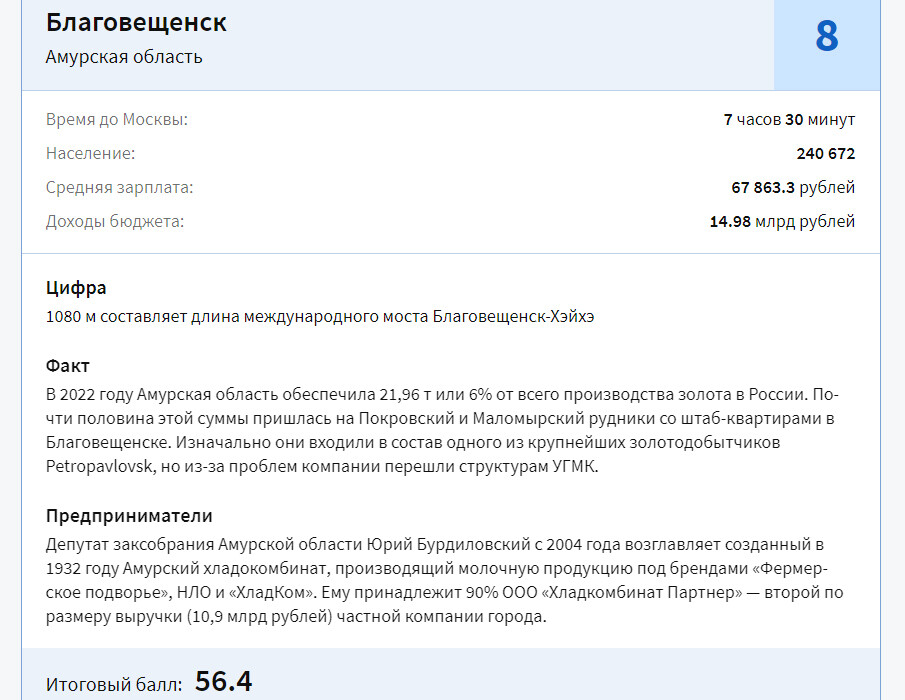 Благовещенск в этом топе выглядит так: