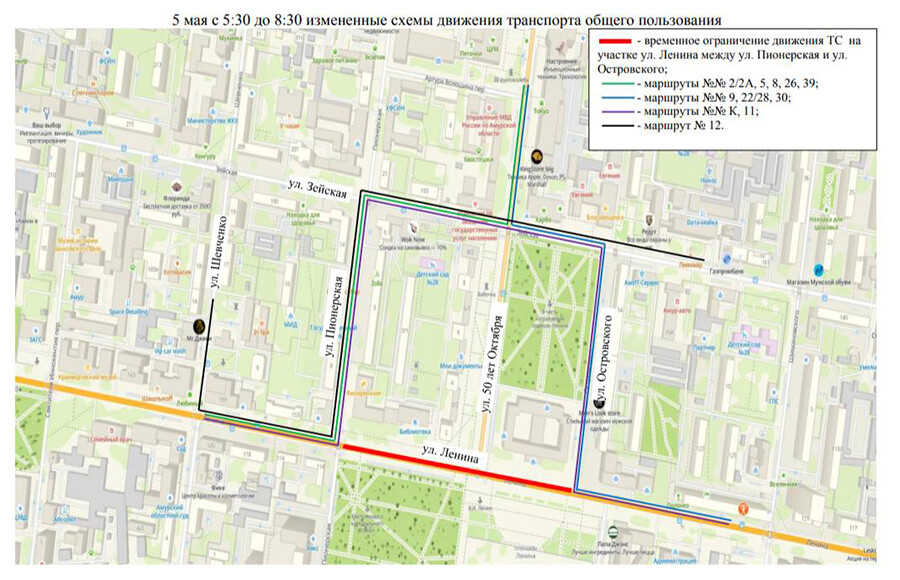 В субботу, 4 мая, движение ограничат на Ленина между Пионерской и Островского. Во вторник, 7 мая, – на Ленина между Шевченко и Театральной. Общественный транспорт также пойдет по временным схемам.