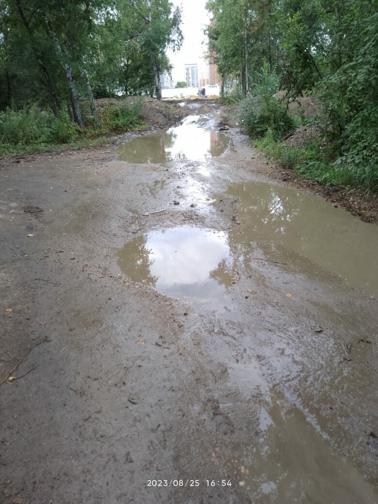 «Сейчас тракториста отправили одного, и он по окраинам кучки собирает, хотя тут надо два Камаза пескогравия и всё разровнять. Мы хотим, чтобы восстановили дорогу, которая шла мимо нашего дома и к выезду на Набережную. Октябрьскую перекрыли, перелопатили, шлагбаум, который то закрывают, то открывают. Дорогу тут планируют продолжать Конную. Оборудование завезли, здесь всё разворотили и на этом всё закончилось. Вроде как в сентябре должны начать. У нас человек в доме больной, а скорая не смогла проехать и пришлось жильца на носилках через всю рощу нести, по щиколотку в грязи до скорой. К нам ни такси не едет, ничего нельзя завести», – рассказала жительница дома Татьяна.