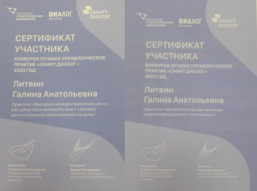 Сертификаты участников во Всероссийском конкурсе лучших управленческих практик «Смарт-диалог» на платформе АСИ «Смартека» получил коллектив отдела образования и молодежной политики округа.