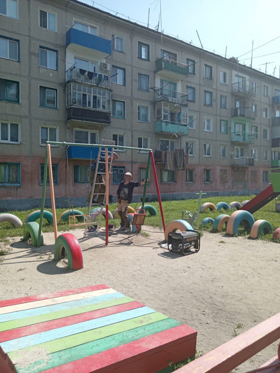 Качелю на детской площадке починили рабочие Возжаевской администраци в микрорайоне «Гарнизон» во дворе ДОСа 66.