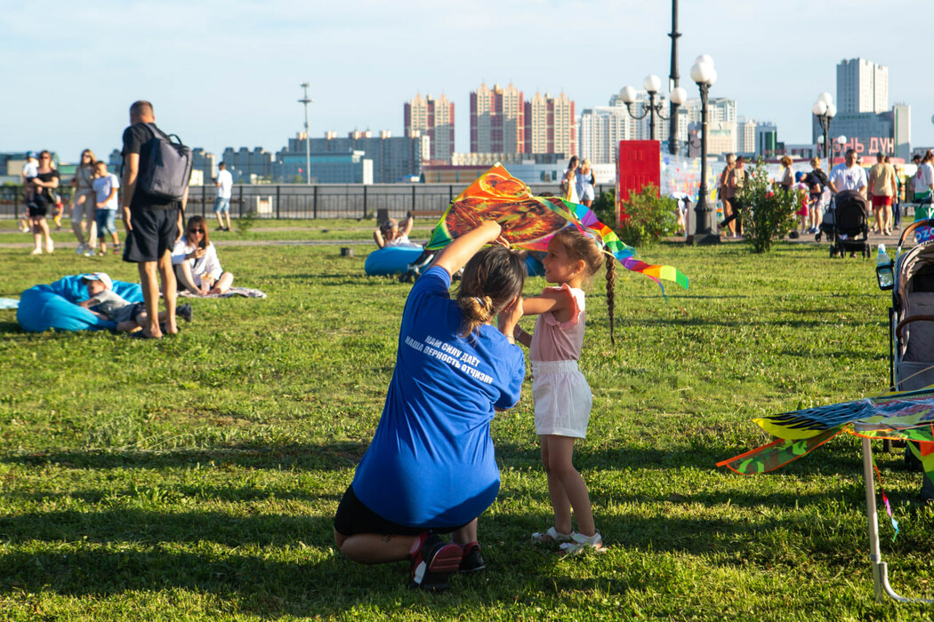 Дети и их родили запускали воздушных змеев, на площадке по соседству ребята рисовали на пищевой пленке. Также для малышей устроили и спортивные состязания. Кто-то выбрал автоспорт и принял участие в заезде, а кто-то из малышей под чутким руководством тренеров-родителей попробовал себя в «заползе».