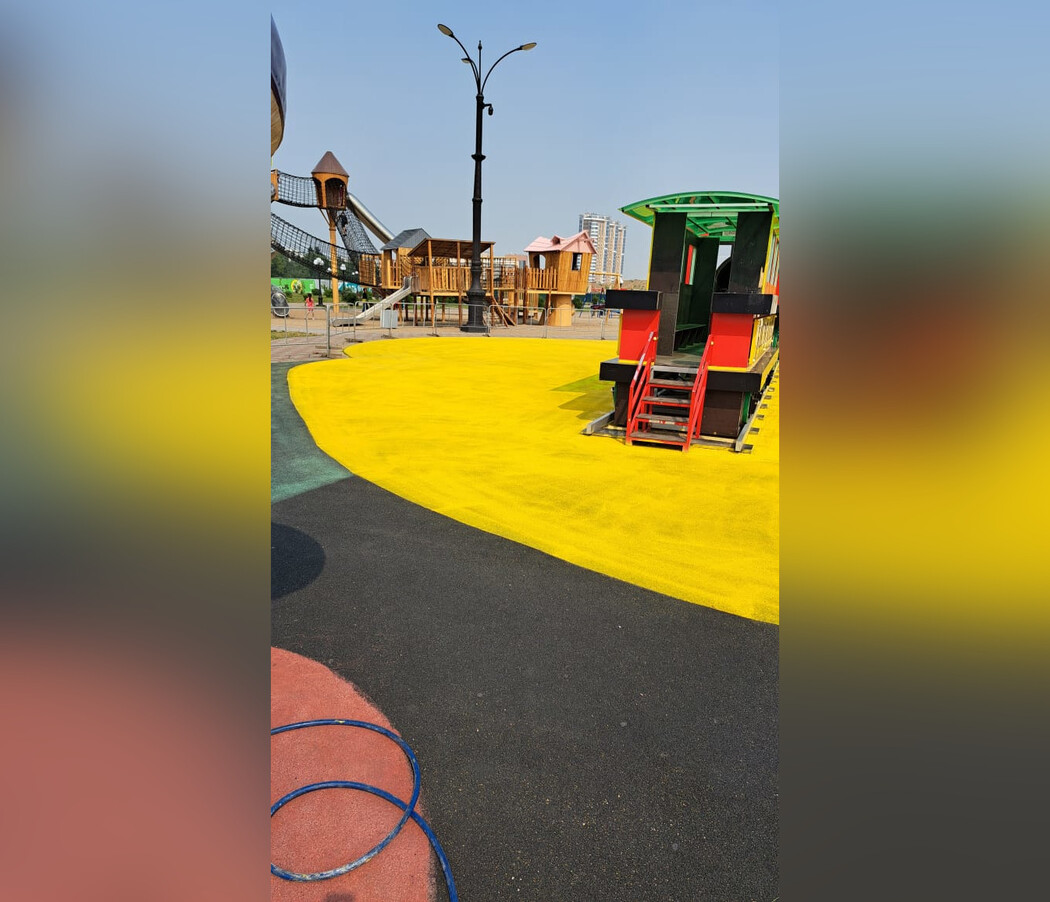 Фото: администрация Благовещенска На детской площадке городской набережной красят антитравматичное резиновое покрытие.