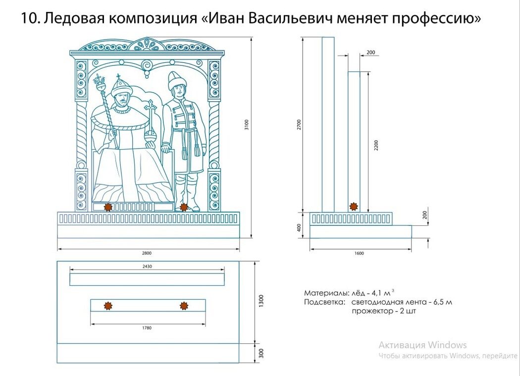 Авторы эскизов предложили сделать изо льда, помимо традиционных Деда Мороза и Снегурочки, а также символа года – дракона, такие композиции, как «Трус, Балбес и Бывалый», «Кавказская пленница», «Иван Васильевич меняет профессию», «12 стульев», «Приключения Шурика», «Спортлото 82», «Газированная вода».