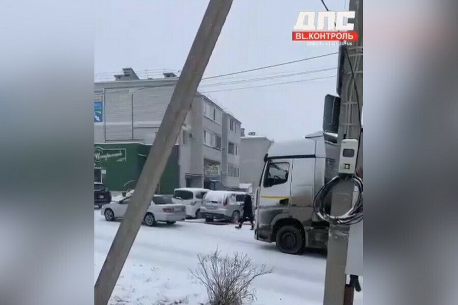 Легковушка, буксуя, медленно, но все же тянет за собой тяжелый автопоезд. Автор ролика, который опубликовал Telegram-канал dpskontrol_28rus , мягко говоря, был удивлен.
