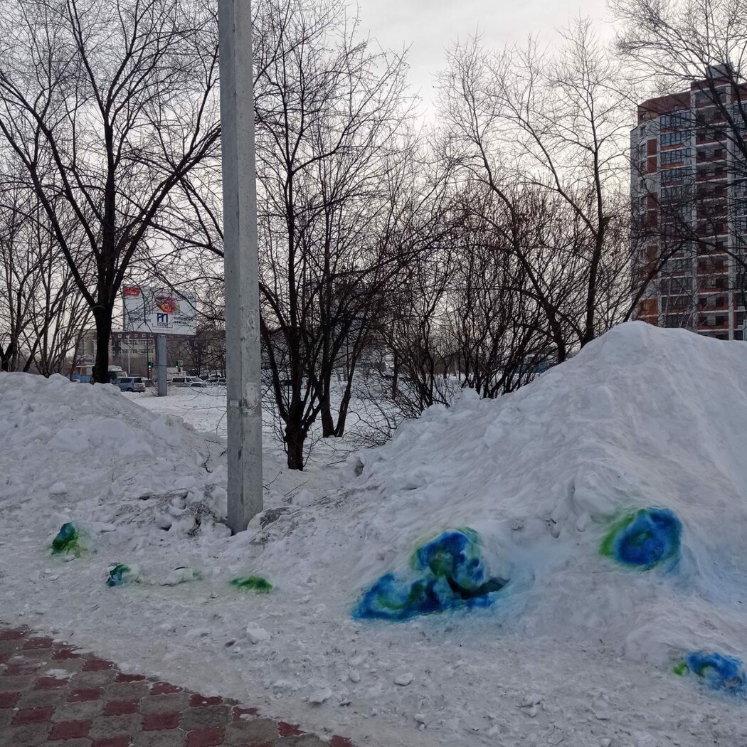 Снег, на котором животные оставляют желтые следы, благовещенцы-творцы раскрасили в сине-зеленые оттенки, а свою акцию назвали так: «Фонтаны беспричинного счастья».