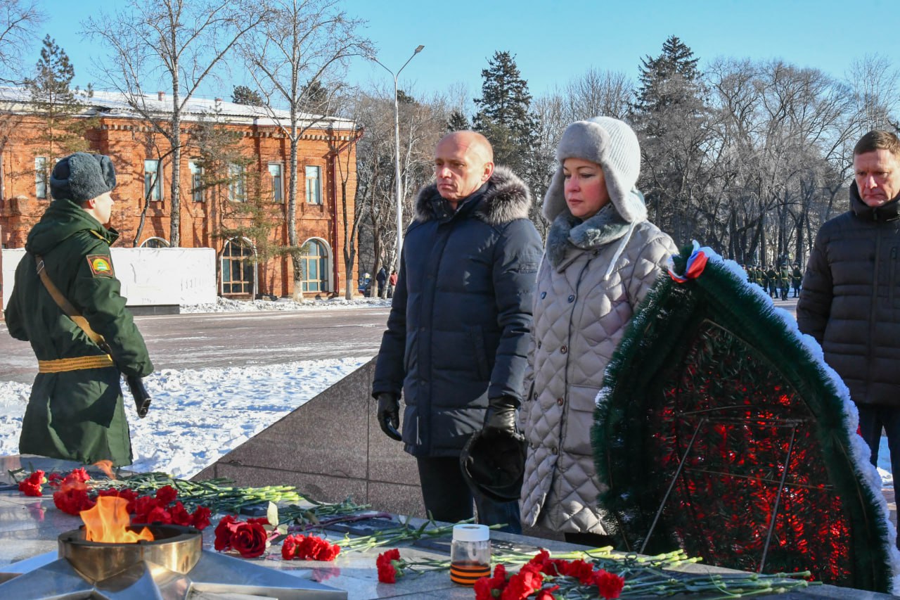 На площади Победы состоялась торжественная церемония возложения цветов к Огню памяти. В мероприятии приняли участие председатель Думы Степан Попов и городские депутаты.