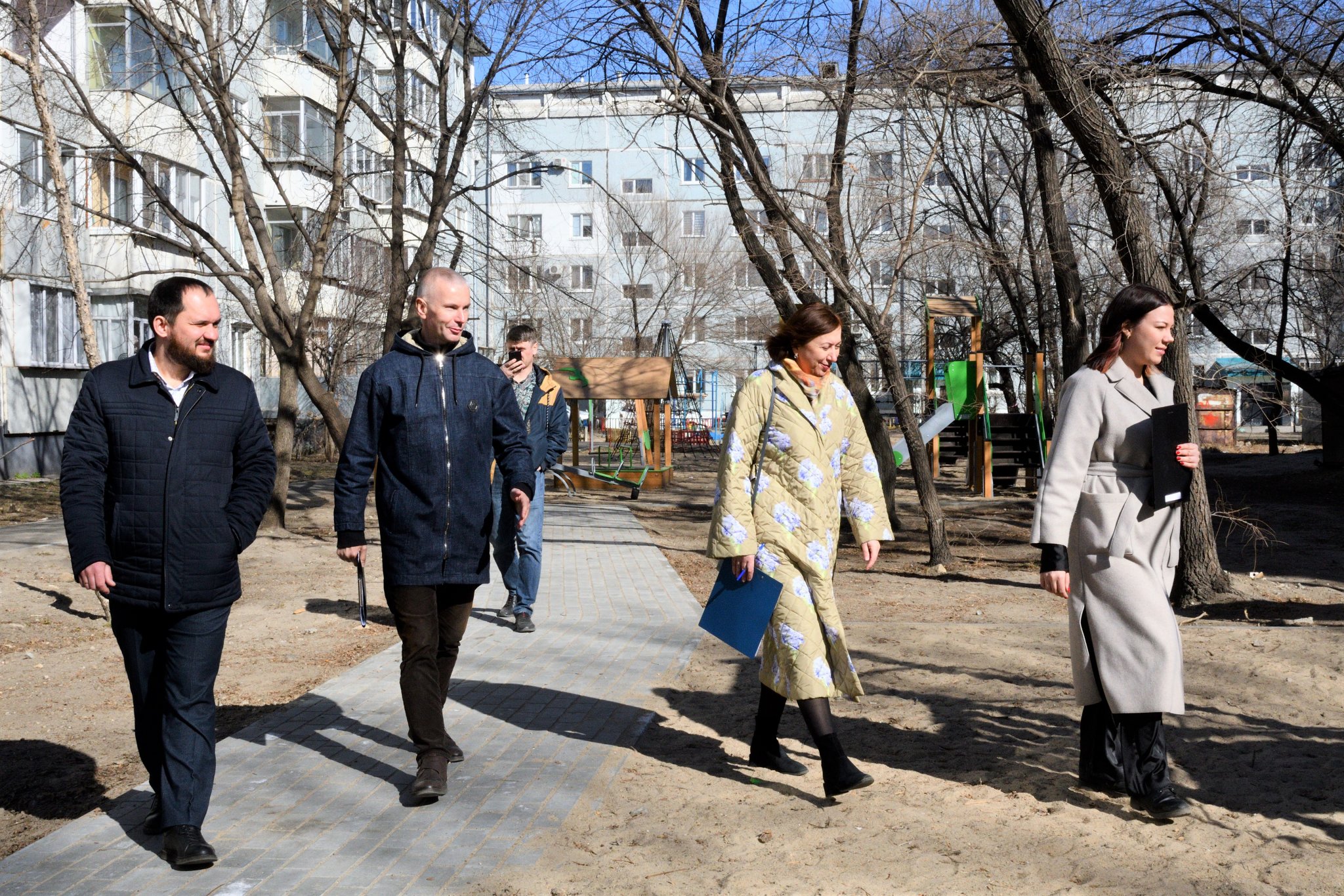 Провели осмотр и оценили состояние площадок домов по улице Театральная 31, Зейская 88 и Партизанская 22/2 представители управления ЖКХ, Центра развития территорий, подрядных организаций и депутаты городской Думы. Эти дворовые территории были благоустроены в 2022 году в рамках федеральной программы «1000 дворов» и уже более полугода жители близлежащих домов их активно используют.