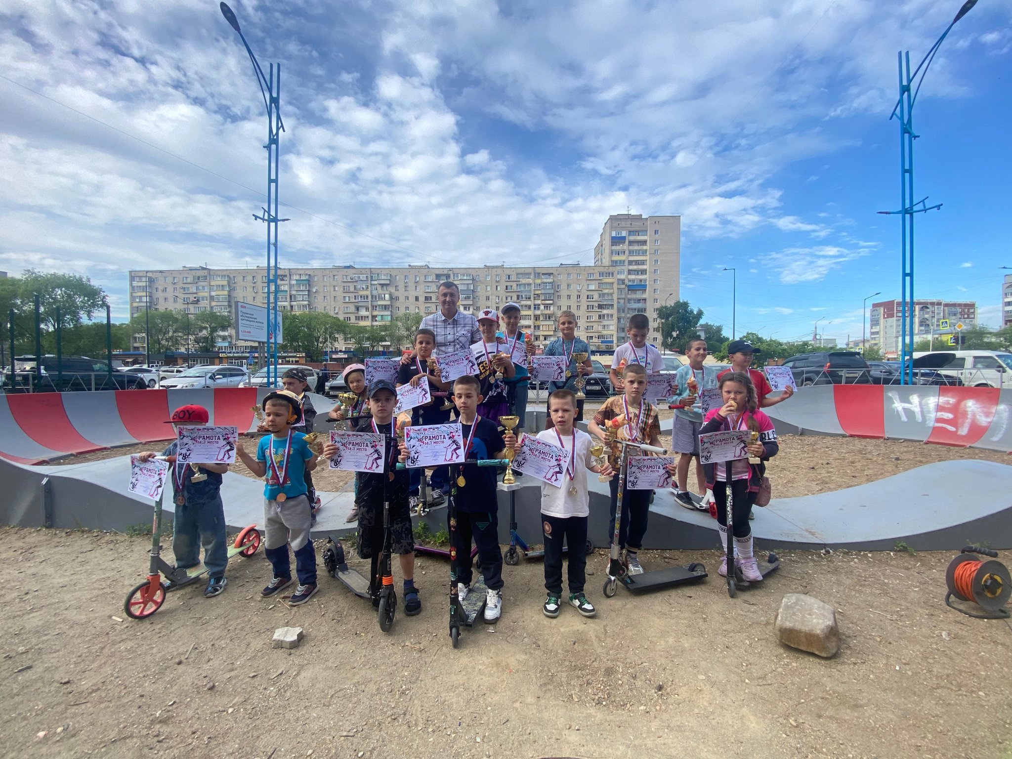 После этого для ребят Арсен Алибекович организовал спортивное мероприятие. Они посоревновались в скоростном скольжении на памп-треке. Победители получили медали, кубки и грамоты, а все участники мероприятия — сладкие призы.