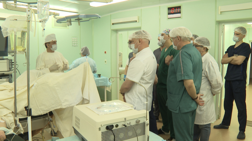 «Здесь идет послойное удаление ткани аденомы предстательной железы, и пациент практически не кровит. То есть кровотечения нет. Одновременно с удалением ткани здесь происходит коагуляция тканей. А до этого мы выполняли оперативное вмешательство, там кровотечение было гораздо больше и длительность операции занимала больше. В связи с этим послеоперационный период, то есть нахождение пациента в отделении, оно было более длительным — нежели, мы надеемся, будет сейчас», — говорит заведующий курсом урологии АГМА Дмитрий Величко.