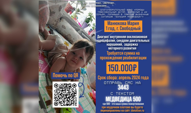Источник фото: ПСО «Гром» Семье необходимо 150 тысяч рублей. Семья из Свободного собирает деньги на реабилитацию маленькой дочери.