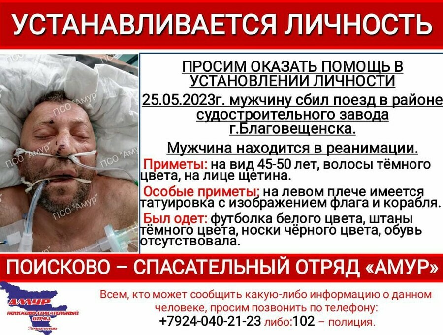 В настоящее время пострадавший находится в коме в реанимации. В установлении личности просят помощи в ПСО «Амур».