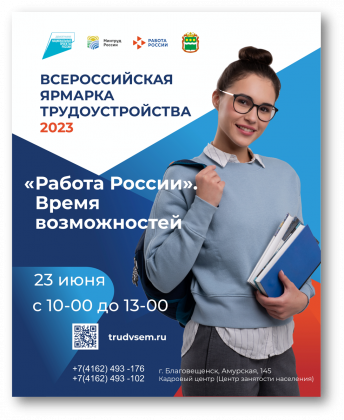 Федеральный этап Ярмарки трудоустройства пройдет на территории Амурской области 23 июня 2023 года. Основная площадка для проведения – Кадровый центр «Работа России» (Центр занятости населения в г. Благовещенск, ул. Амурская, 145) с 10-00 до 13-00 часов.