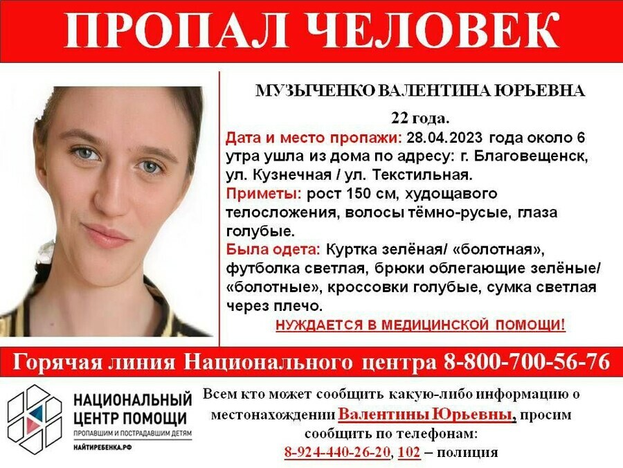 В Благовещенске 28 апреля пропала 22-летняя Валентина Юрьевна Музыченко. Информацию от Национального центра помощи пропавшим и пострадавшим детям распространил ПСО «Гром».