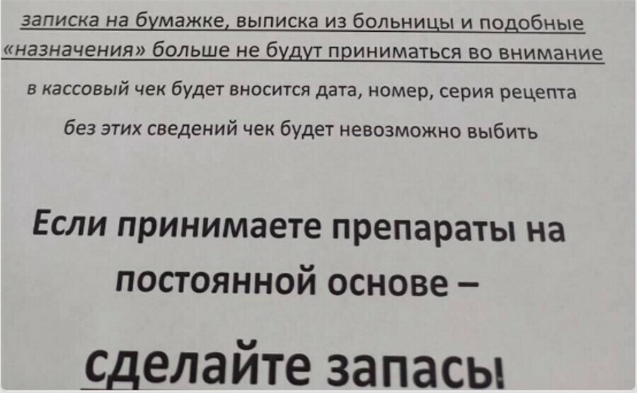 Кроме того, аптеки будут обязаны фиксировать данные рецепта в системе мониторинга движения лекарственных средств. Подобные объявления также стали появляться в аптеках по всей России, где фармацевты призывают запастись лекарствами. Предупреждение успешно разлетелось по соцсетям.